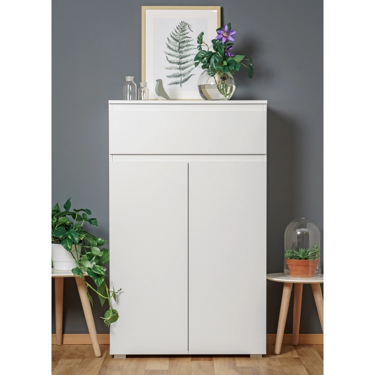 barevné provedení bílá 2 dveře, 3 police, 1 široká zásuvka s kovovými pojezdy