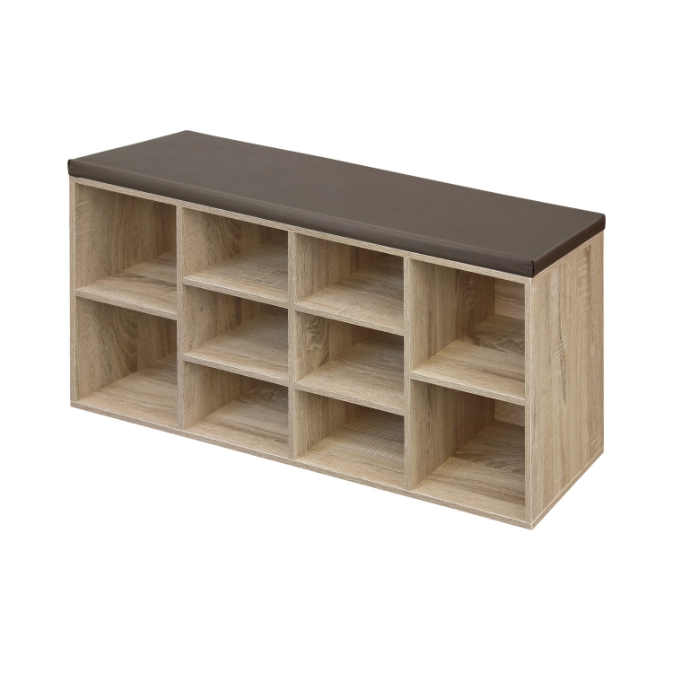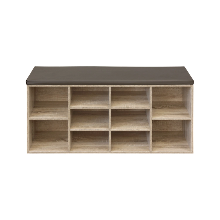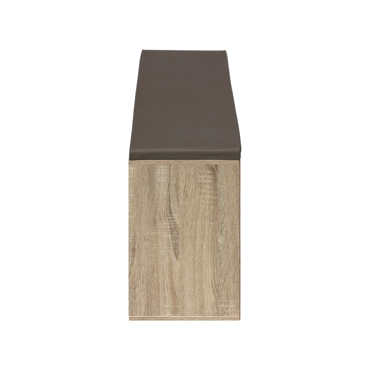 barevné provedení dub Sonoma polstrovaný sedák, deset polic potah sedáku kůže – imitace, barevné provedení hnědá větší police (š/h/v) 24,2 × 29 × 21 cm menší police (š/h/v) 24,2 × 29 × 13,8 cm doporučená nosnost 200 kg