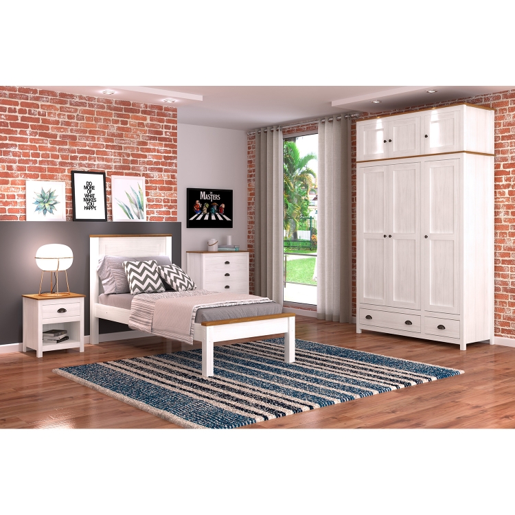 Materiál Masiv Barva Bílá, Hnědá Dekor dřeva borovice Typ postele Jednolůžková Úložný prostor bez úložného prostoru Velikost 90x200 Rozměry (cm) 214 x 101 x 110 cm Váha: 23 kg Přepravní rozměry a info: Karton: 3 ks Kód produktu: mp-206361-jednoluzko-90x200-topazio / 206361 -