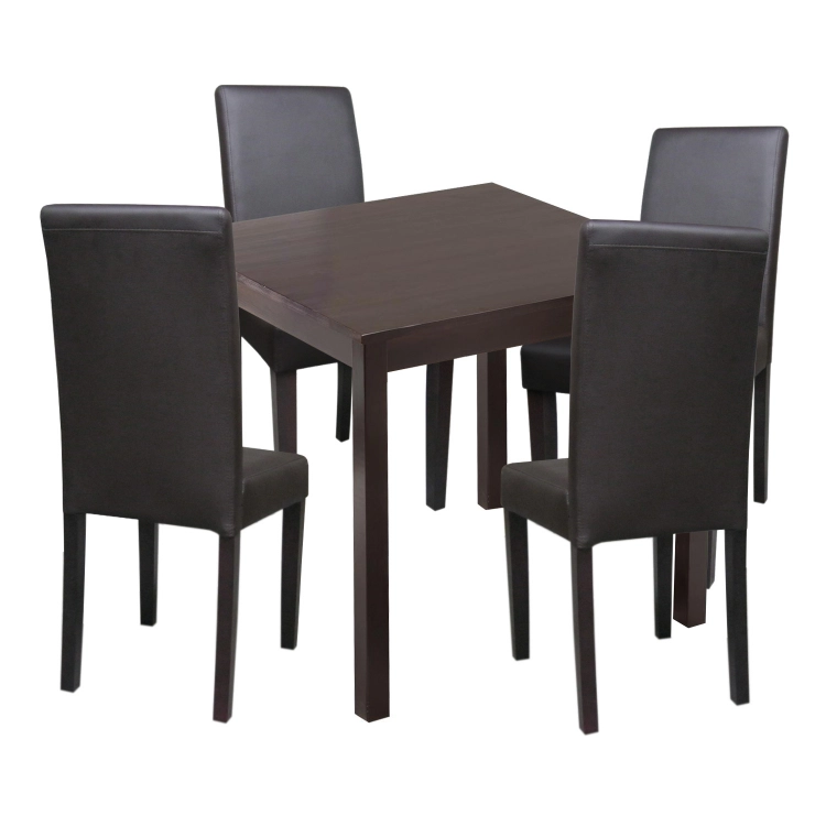 jídelní stůl 8842H a 4 jídelní židle PRIMA 3035 stůl masiv tmavohnědý lak, židle nohy z masivu, barevné provedení tmavě hnědý lak potah kůže – imitace, barevné provedení hnědá, výška sedu 47 cm rozměr stolu (š/h/v): 75 × 75 × 73 cm, rozměr židle (š/h/v): 42 × 48 × 92 cm
