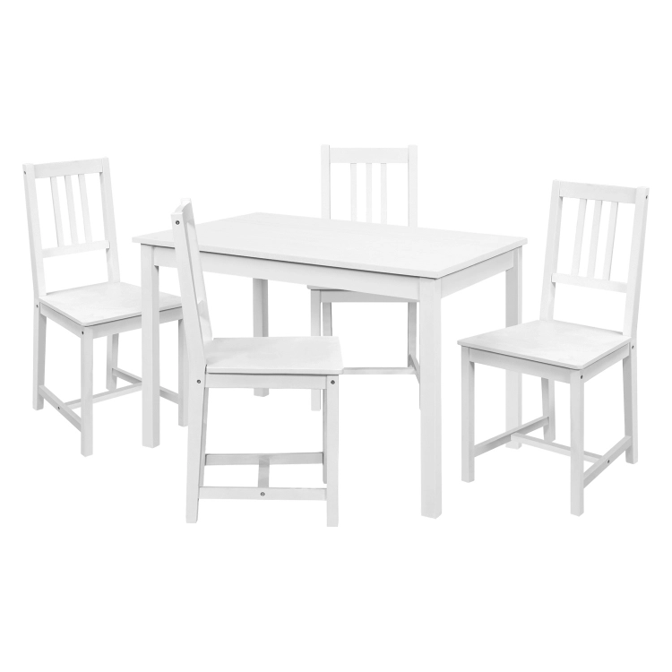 jídelní stůl 8848B a 4 jídelní židle 869B materiál masiv borovice, barevné provedení bílý lak, výška sedu 45 cm rozměr stolu (š/h/v): 118 × 75 × 73 cm, rozměr židle (š/h/v): 41 × 42 × 91 cm