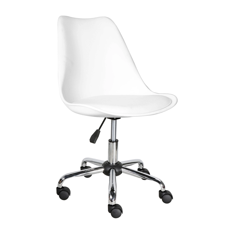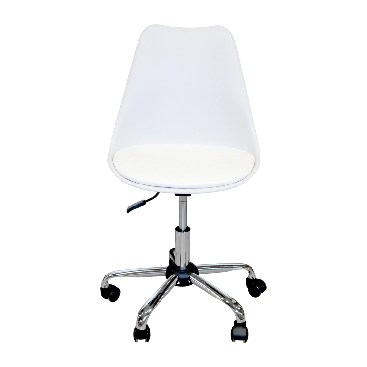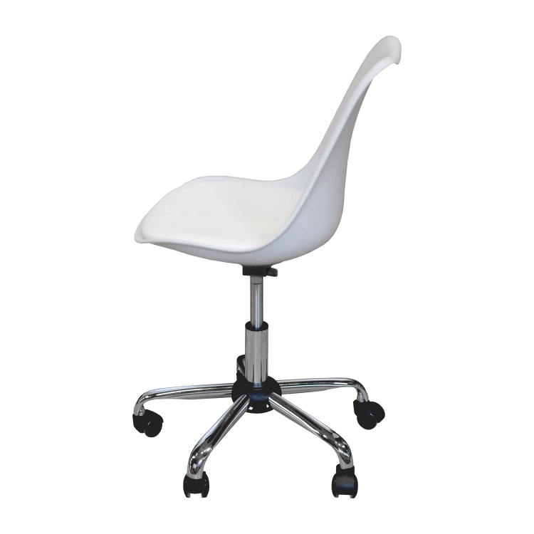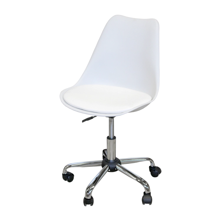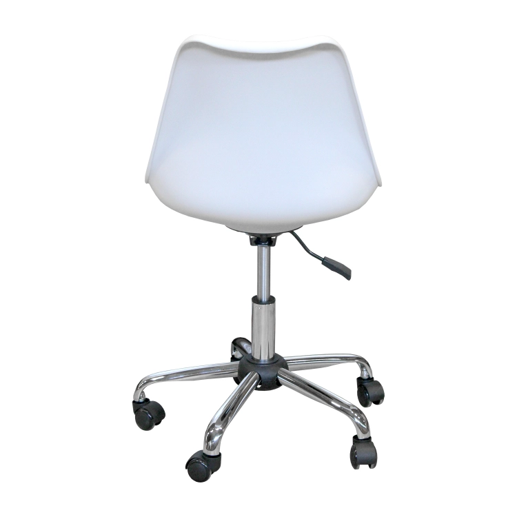 materiál sedačky plast, potah sedáku kůže – imitace, barevné provedení bílá výškově nastavitelné, výška sedu 46-55 cm kovový pochromovaný kříž