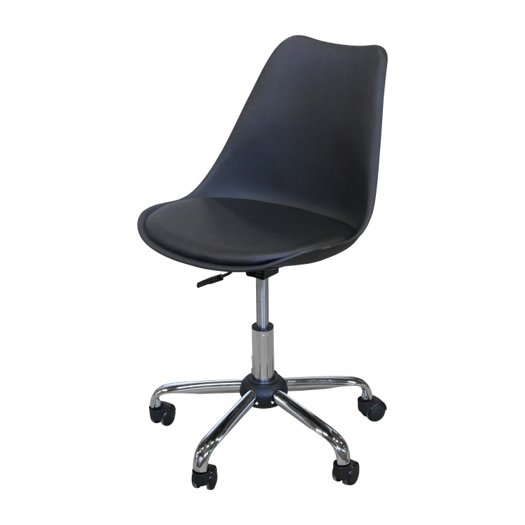 materiál sedačky plast, potah sedáku kůže – imitace, barevné provedení černá výškově nastavitelné, výška sedu 46-55 cm kovový pochromovaný kříž