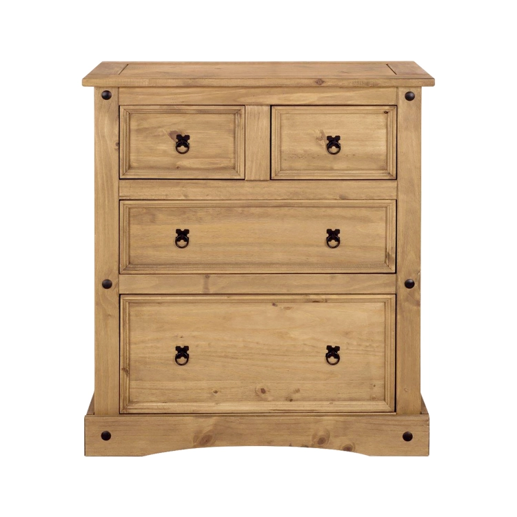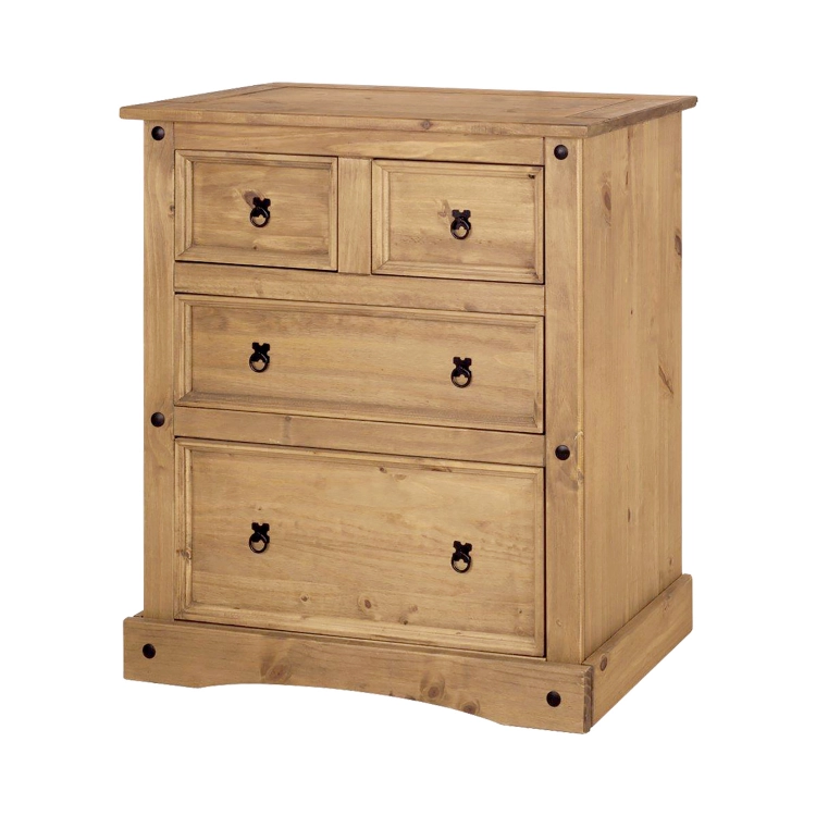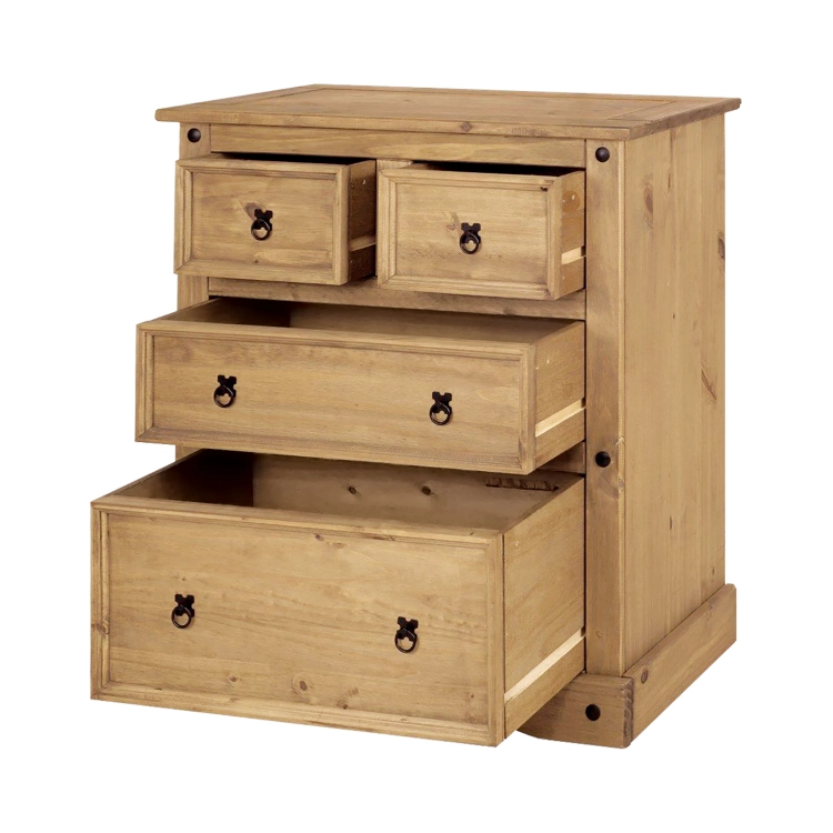materiál masiv borovice voskovaná v medovém odstínu 2 menší a 2 větší zásuvky, kovové ozdobné úchytky součást sestavy Corona 3
