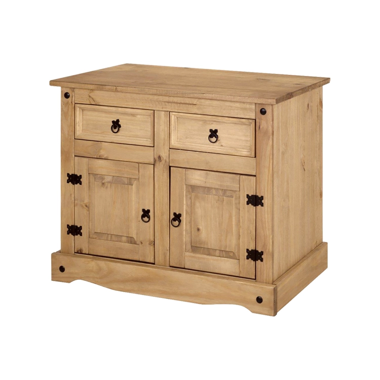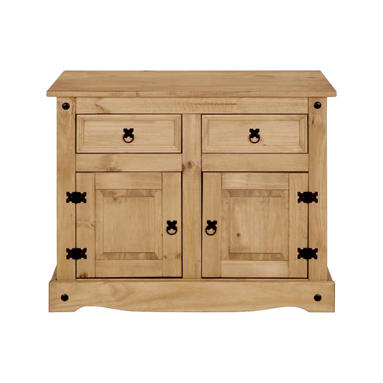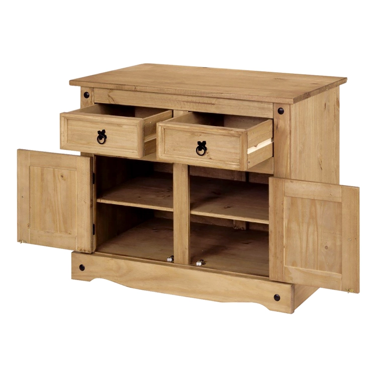 materiál masiv borovice voskovaná v medovém odstínu 2 zásuvky, 2 dvířka, 1 police, kovové ozdobné úchytky součást sestavy Corona 3