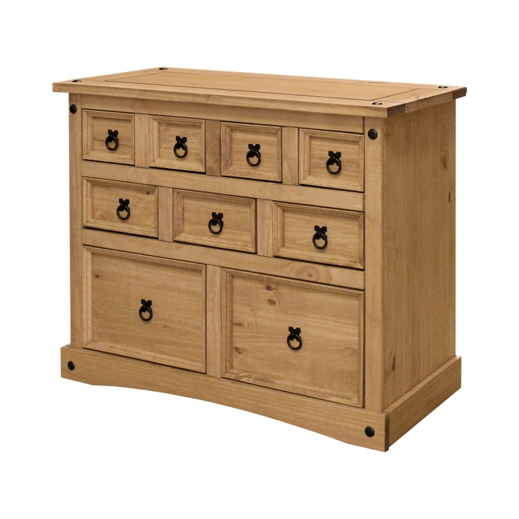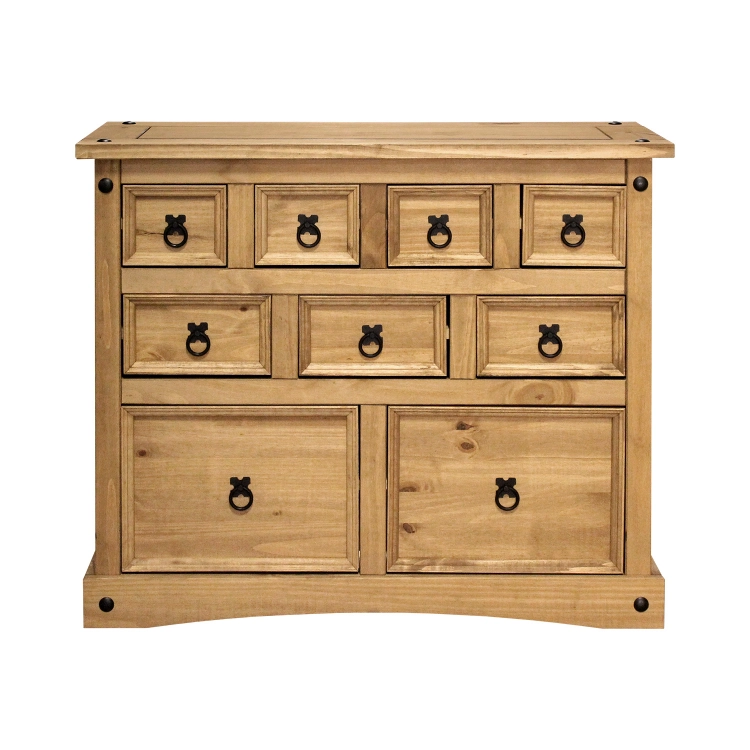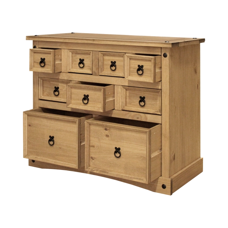 materiál masiv borovice voskovaná v medovém odstínu 4 malé, 3 střední a 2 velké zásuvky, kovové ozdobné úchytky součást sestavy Corona