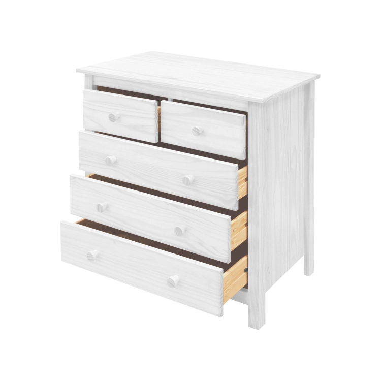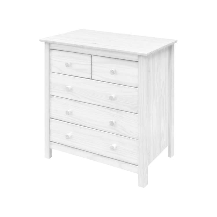 materiál masiv borovice, barevné provedení bílý lak 2 menší a 3 větší zásuvky s kovovými pojezdy