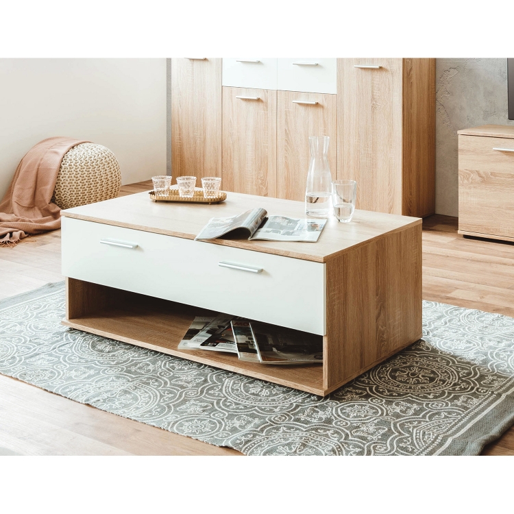 barevné provedení dub Sonoma / bílá 1 široká zásuvka s kovovými pojezdy, 1 police maximální doporučené zatížení stolku je 10 kg maximální doporučené zatížení zásuvky je 3 kg