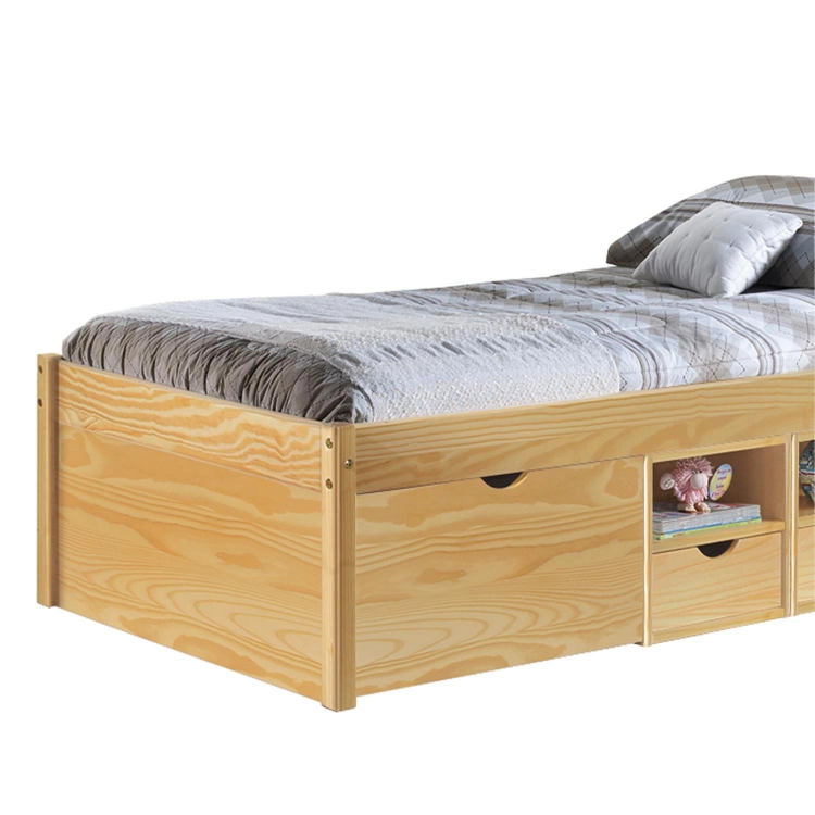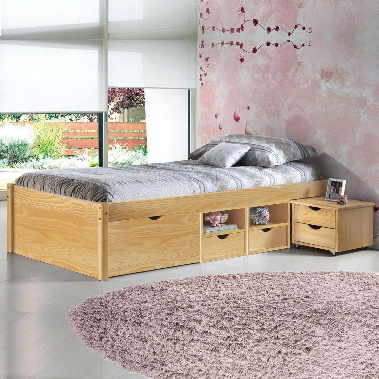 materiál masiv borovice, lakované provedení praktické úložné prostory pod postelí, výsuvný noční stolek a rošt jsou v ceně matrace není v ceně, doporučený rozměr matrace 90 × 200 cm (M2, M5, M24, M26, M34, M35)