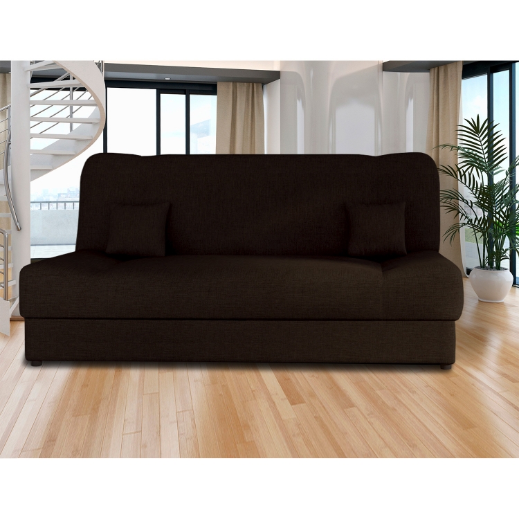 textilní potah, barevné provedení hnědá jádro z vlnité pružiny, výška sedu 40 cm, hloubka sedu 55 cm, rozměr rozložené 190 × 120 cm rozkládací s úložným prostorem, rozkládání KLIK-KLAK (postup uveden v návodu k montáži) po složení do polohy k sedu upravte krycí látku v zadní části tak, aby zakryla rozkládací mechanizmus