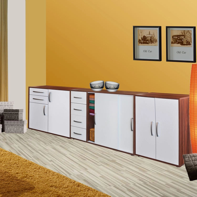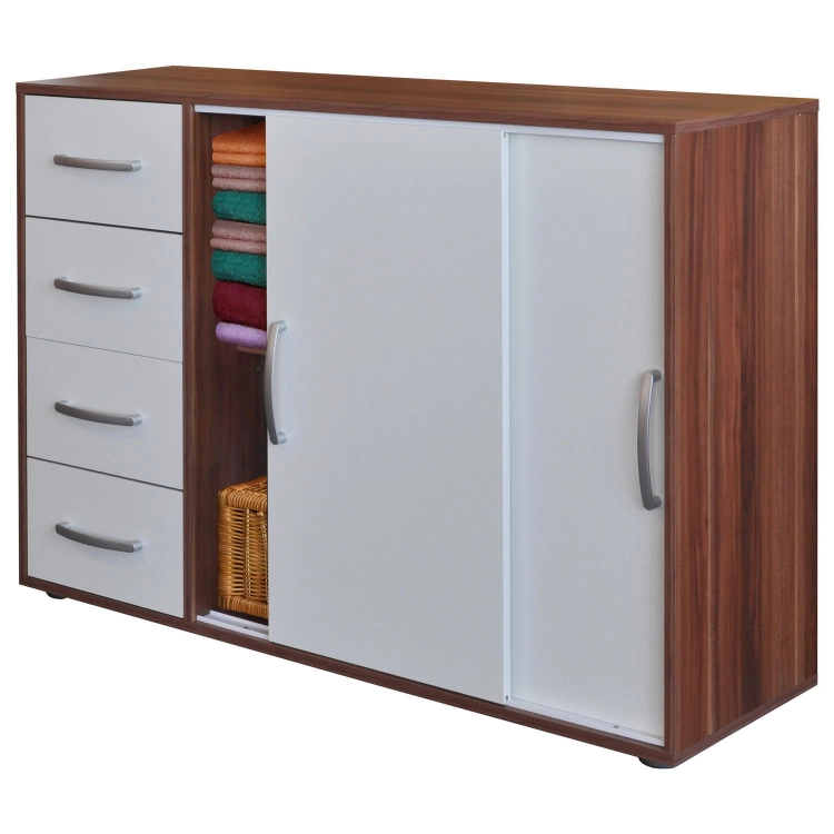 barevné provedení ořech / bílá 2 posuvná dvířka, 1 variabilní police 4 zásuvky, hloubka zásuvky 30 cm barevné varianty: 1503A buk, 1503B bílá