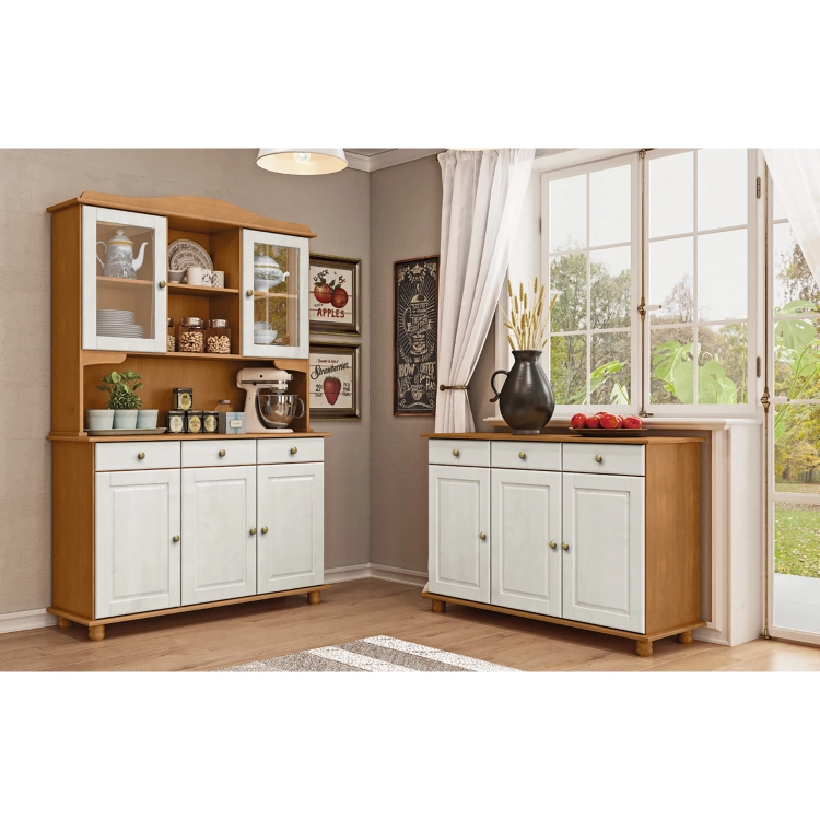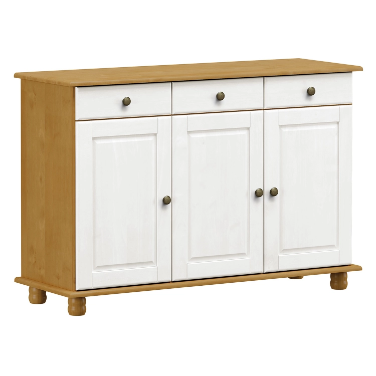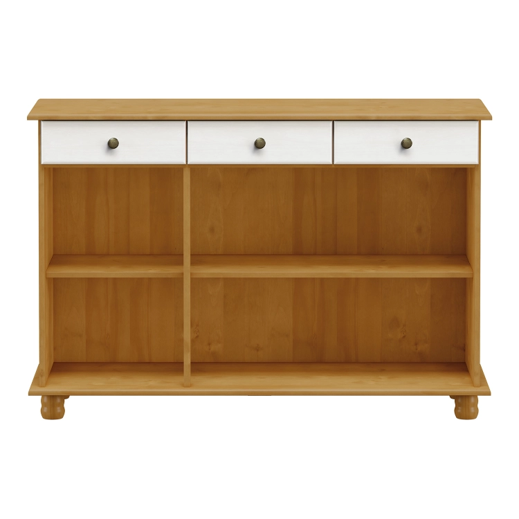materiál masiv borovice, barevné provedení dub / bílý lak 3 dveře, 3 zásuvky s kovovými pojezdy, 1 police