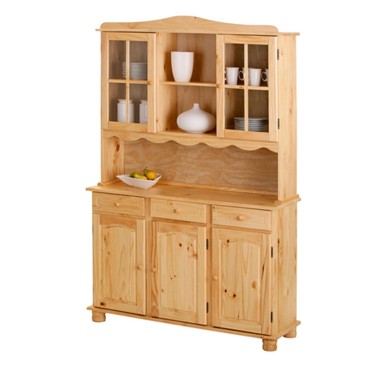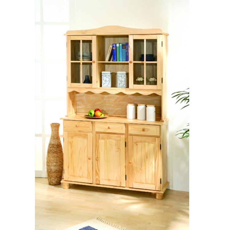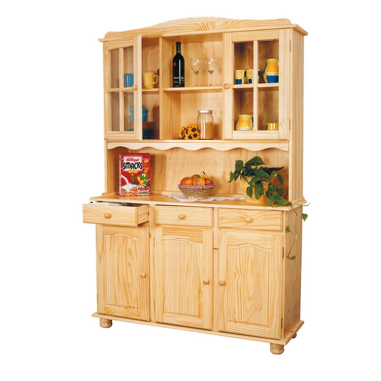 materiál masiv borovice, lakované provedení v horní části 2 prosklená dvířka, 2 police ve spodní části 3 plná dvířka, 3 zásuvky s kovovými pojezdy hloubka horní části 32 cm