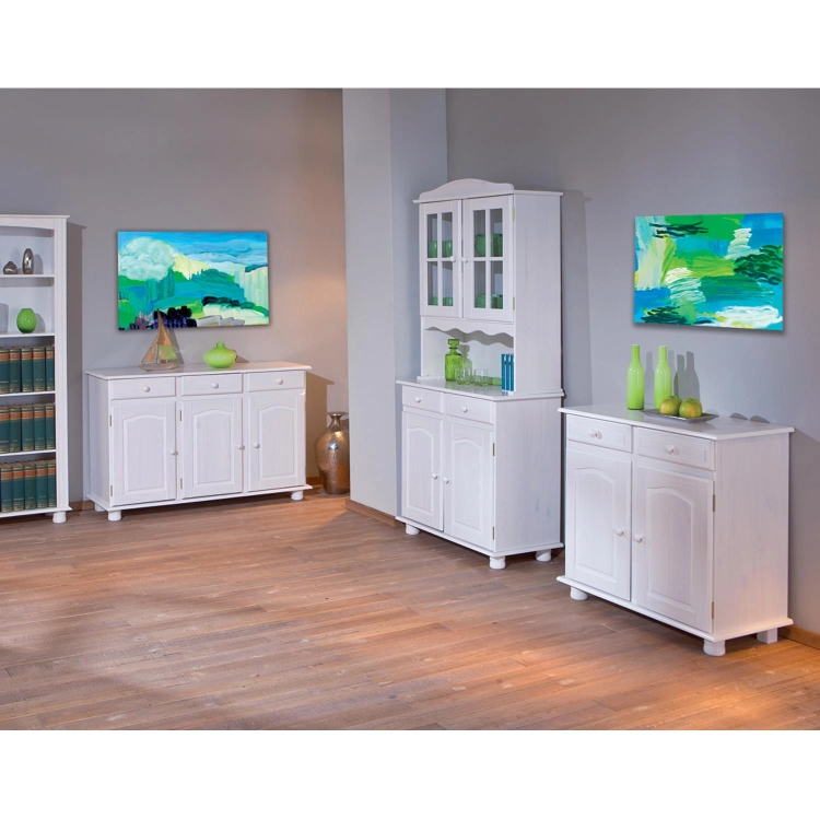 materiál masiv borovice, barevné provedení bílý lak v horní části 2 prosklená dvířka ve spodní části 2 plná dvířka, 2 zásuvky s kovovými pojezdyhloubka horní části 32 cm
