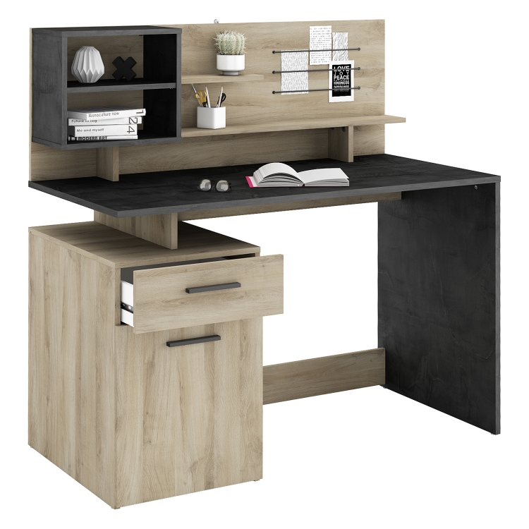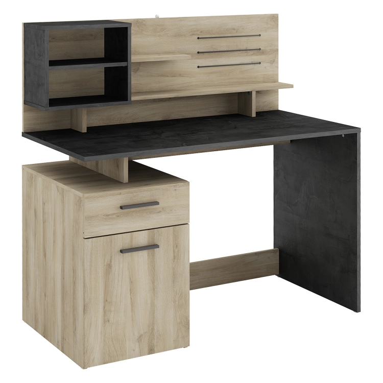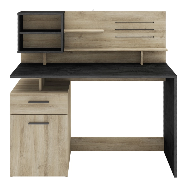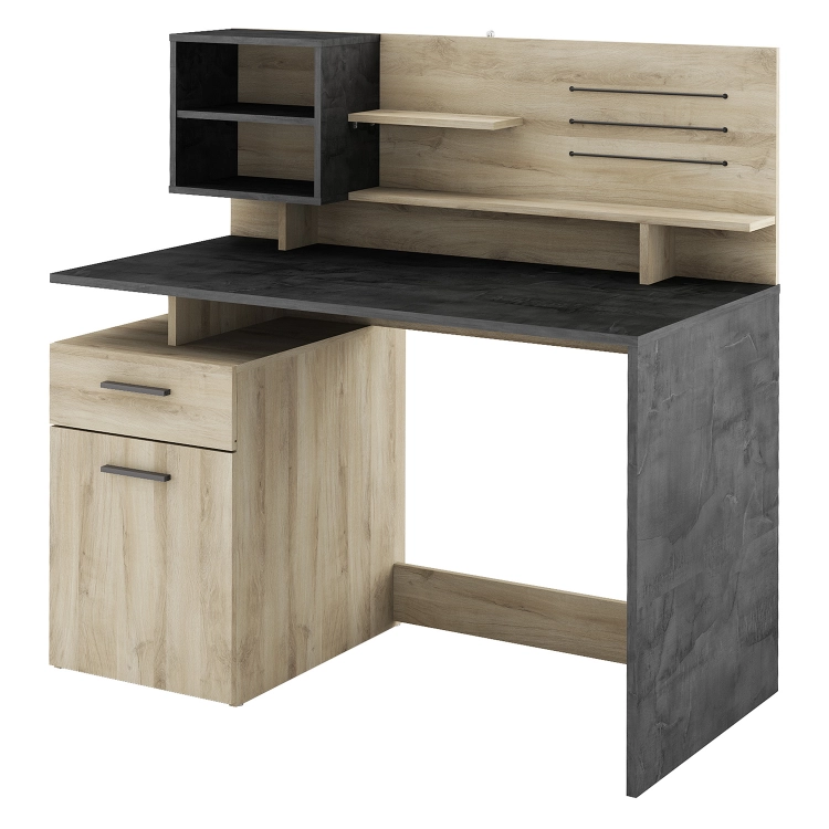 barevné provedení dub Kronberg / černý antik 1 dvířka, 1 zásuvka s kovovými pojezdy na zadní části stolu police a závěsná pružná lanka maximální nosnosti uvedeny v návodu k montáži v pracovní desce průchodka na kabely a zásuvka se dvěma USB porty pro nabíjení mobilů, tabletů, hodinek a podobně, s napětím 5 V DC, pro současné nabíjení 2 zařízení 1 A nebo 1 zařízení 2 A