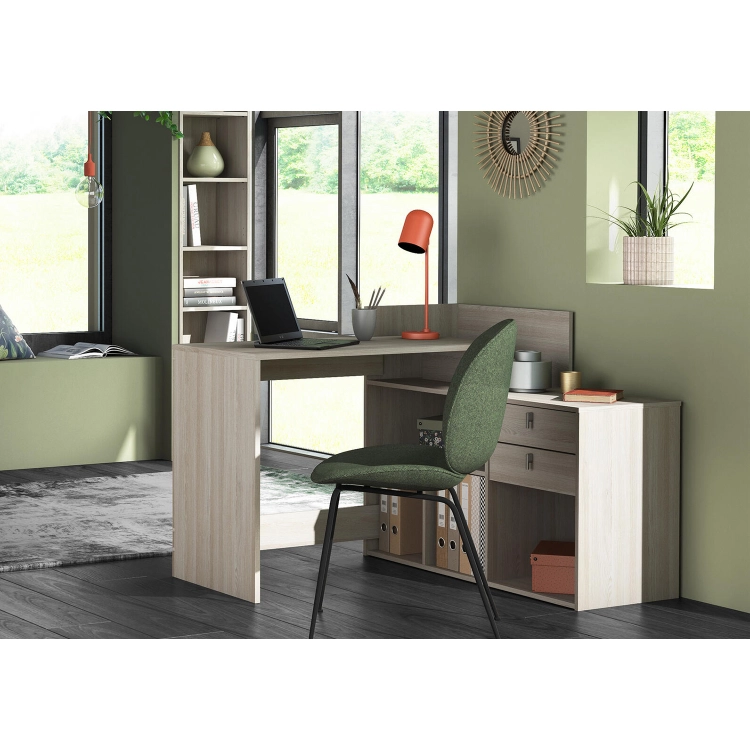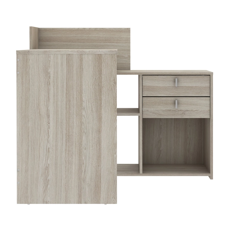 barevné provedení dub Shannon 2 zásuvky s kovovými pojezdy, otevřené i uzavřené police možnost sestavení na pravý i levý roh rozměr hlavní pracovní plochy (š/h) 100 × 50 cm maximální nosnosti uvedeny v návodu k montáži