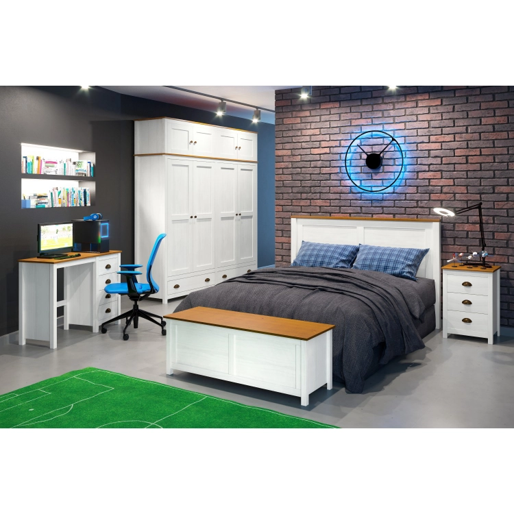 materiál masiv borovice, barevné provedení bílý / hnědý lak čtyři zásuvky s kovovými úchytkami a pojezdy