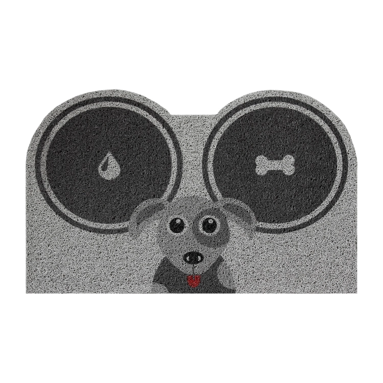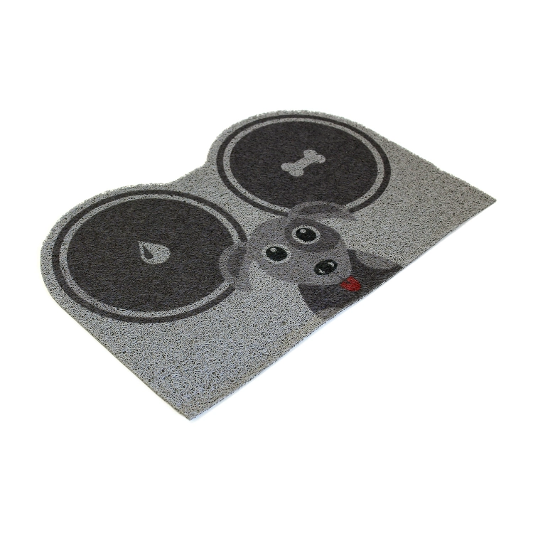 materiál 100% Polyvinylchlorid, barevné provedení šedá s potiskem odolná, snadno omyvatelná protiskluzová rohožka pro exteriér vhodná jako podložka pod misky s krmením pro vašeho mazlíčka materiál je antibakteriální a odolný proti plísním
