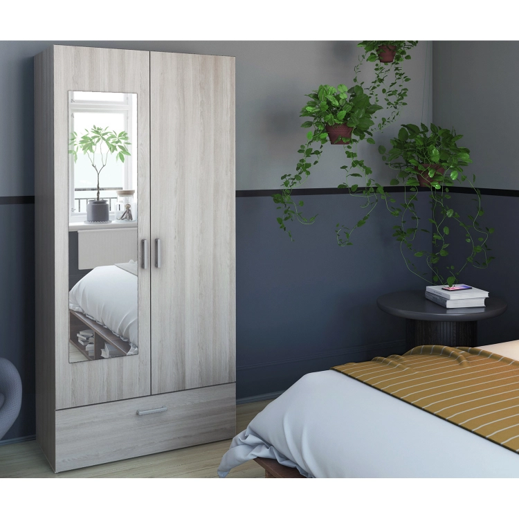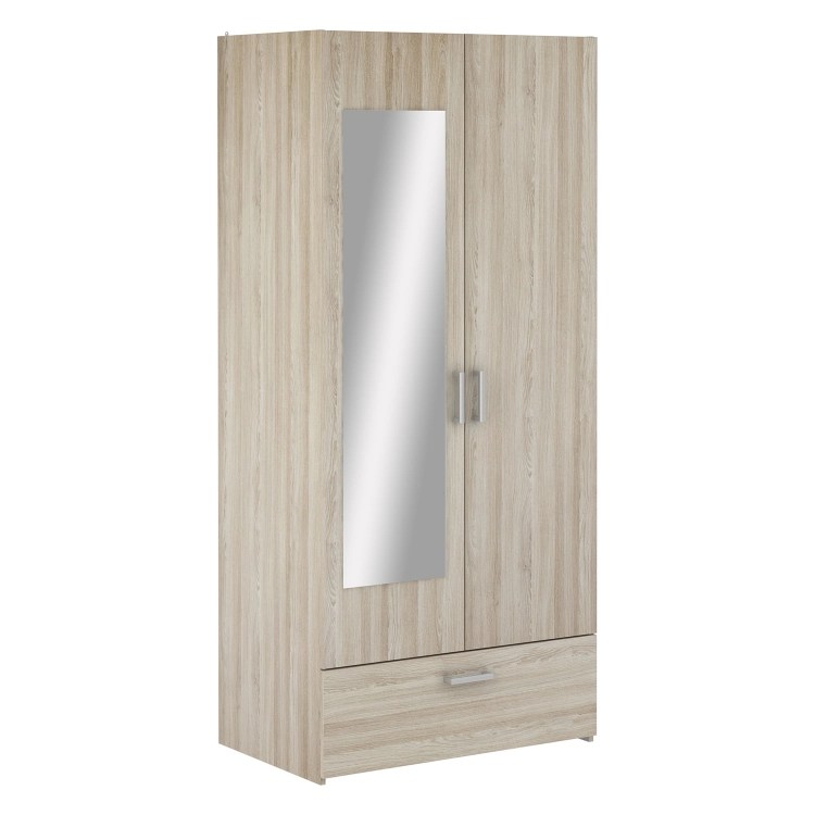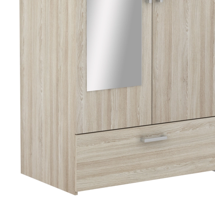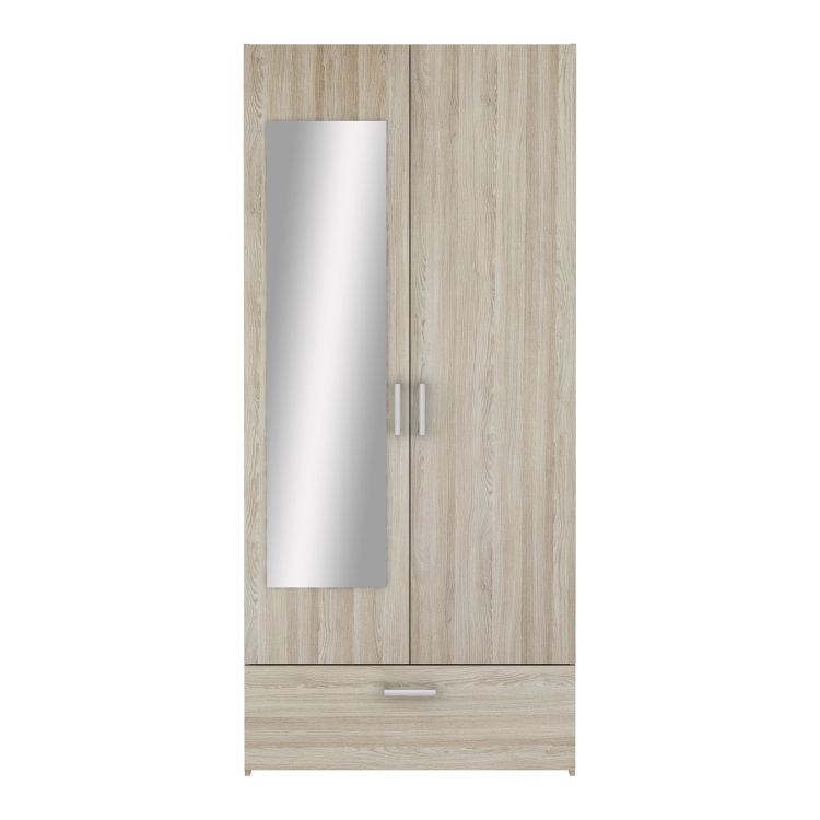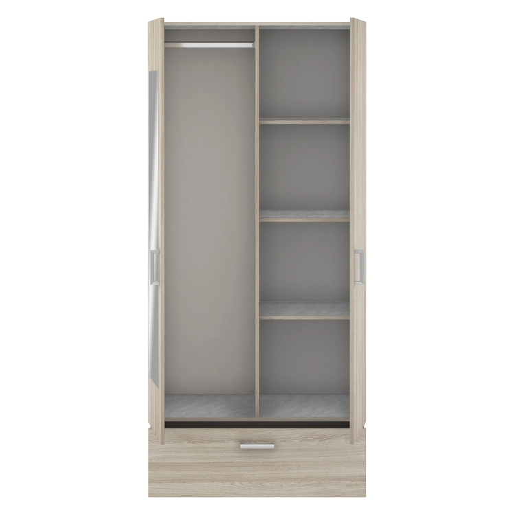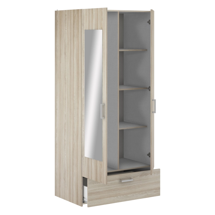 barevné provedení dub Shannon prostor dělený na poloviny, v levé části šatní tyč, v pravé části tři police levé dveře opatřeny zrcadlem o rozměru (š/v) 32 × 126 cm ve spodní části velká zásuvka s kovovými pojezdy