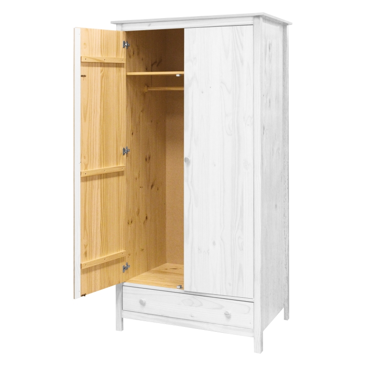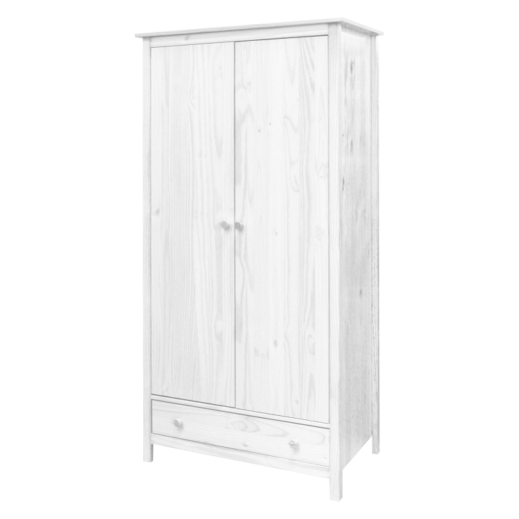 materiál masiv borovice, barevné provedení bílý lak šatní skříň vybavená šatní tyčí a policí ve spodní části zásuvka s kovovými pojezdy