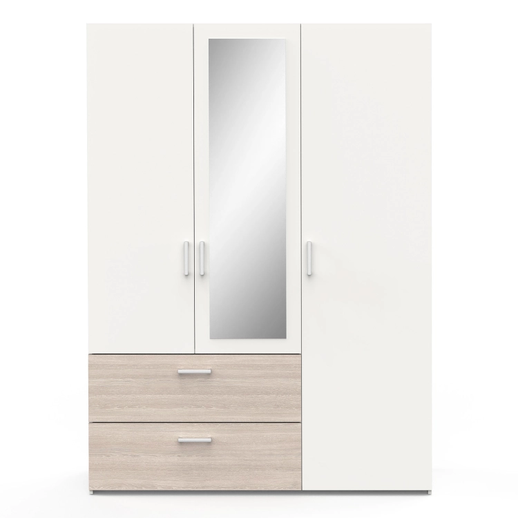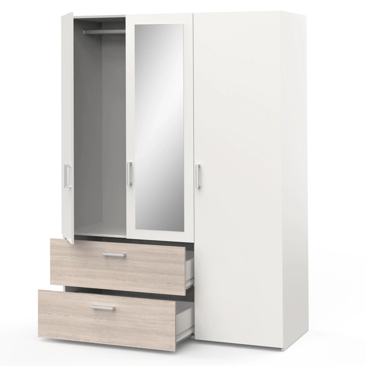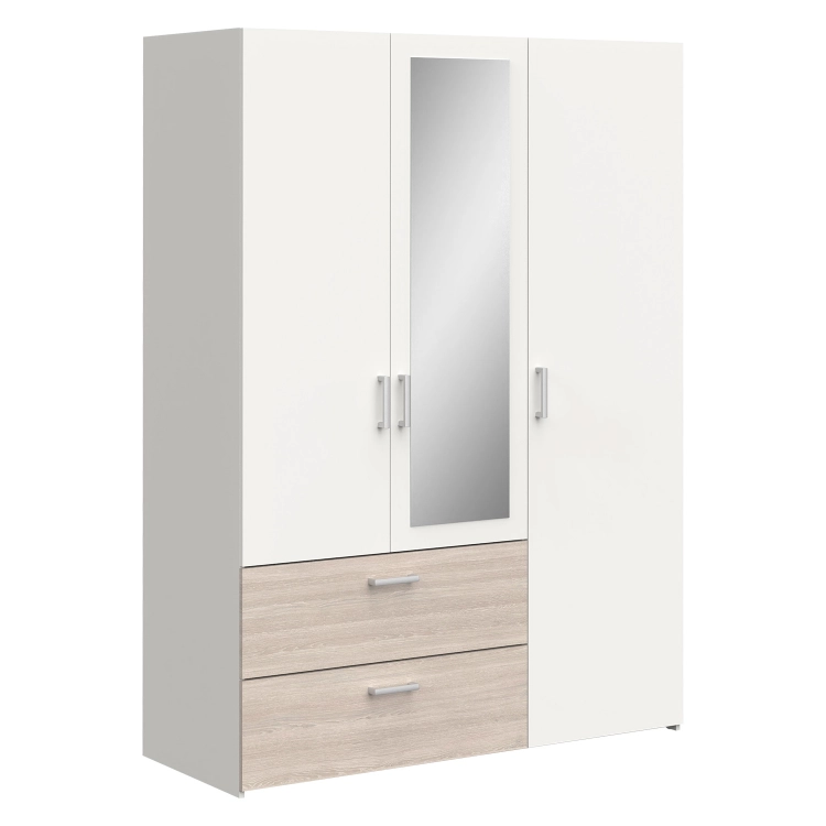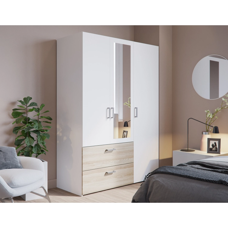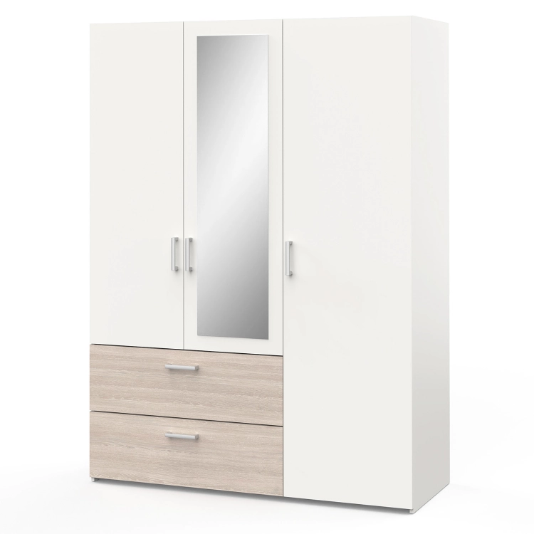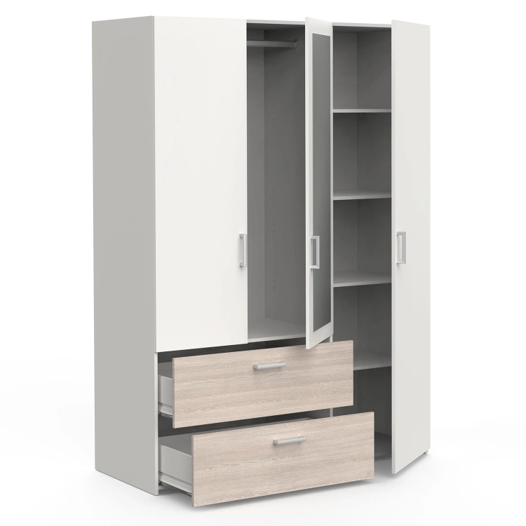 barevné provedení dub Shannon / perleťově bílá prostor dělený v poměru 2:1 v širší části šatní tyč, dvě velké zásuvky s kovovými pojezdy v užší části čtyři variabilní police střední dveře opatřeny zrcadlem o rozměru (š/v) 32 × 126 cm