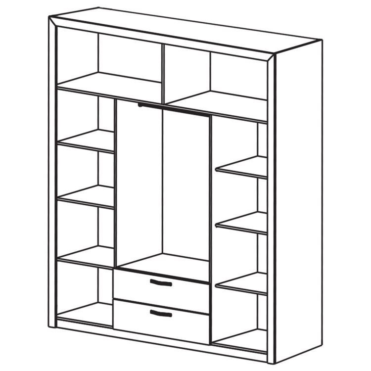 barevné provedení perleťově bílá prostor dělený v poměru 1:2:1, nástavec rozdělený na 2 stejné části je součástí skříně v každé užší části 3 police z toho 2 variabilní, rozměr police (š/h) 55 × 49 cm širší část zrcadlové dveře, šatní tyč, v dolní části 2 zásuvky s kovovými pojezdy rozměr zásuvky (š/h/v) 79 × 37 × 15 cm záda dutinkový plast