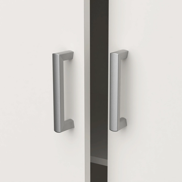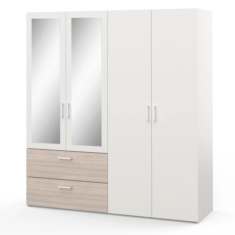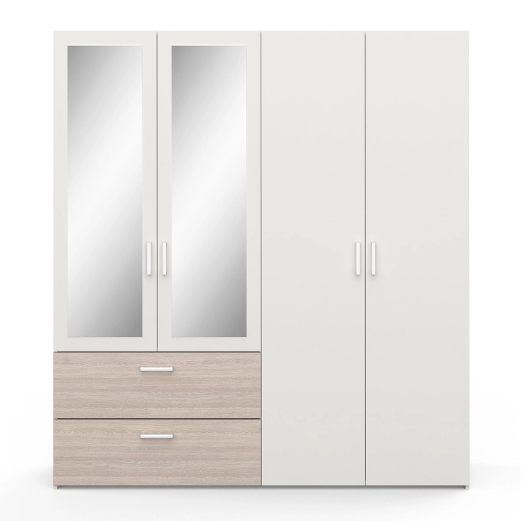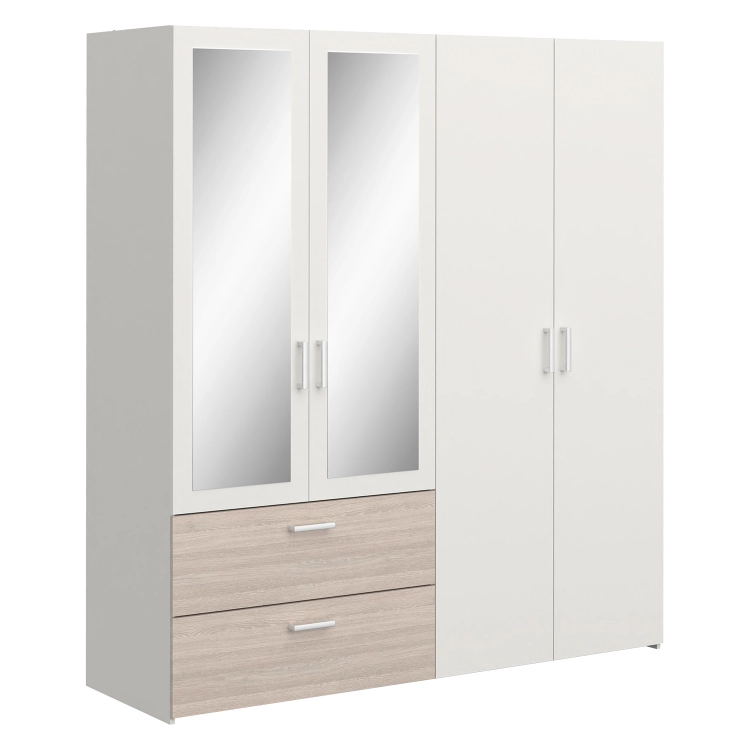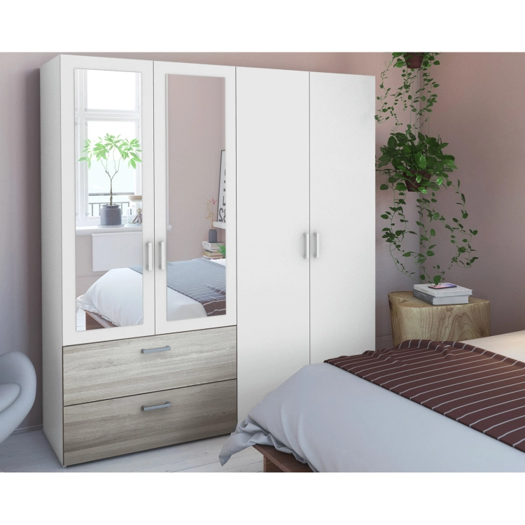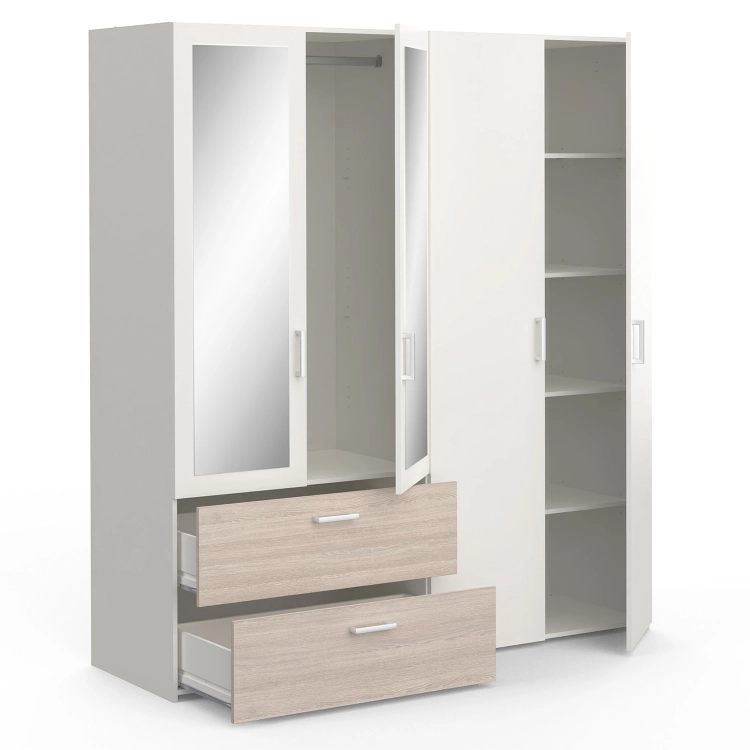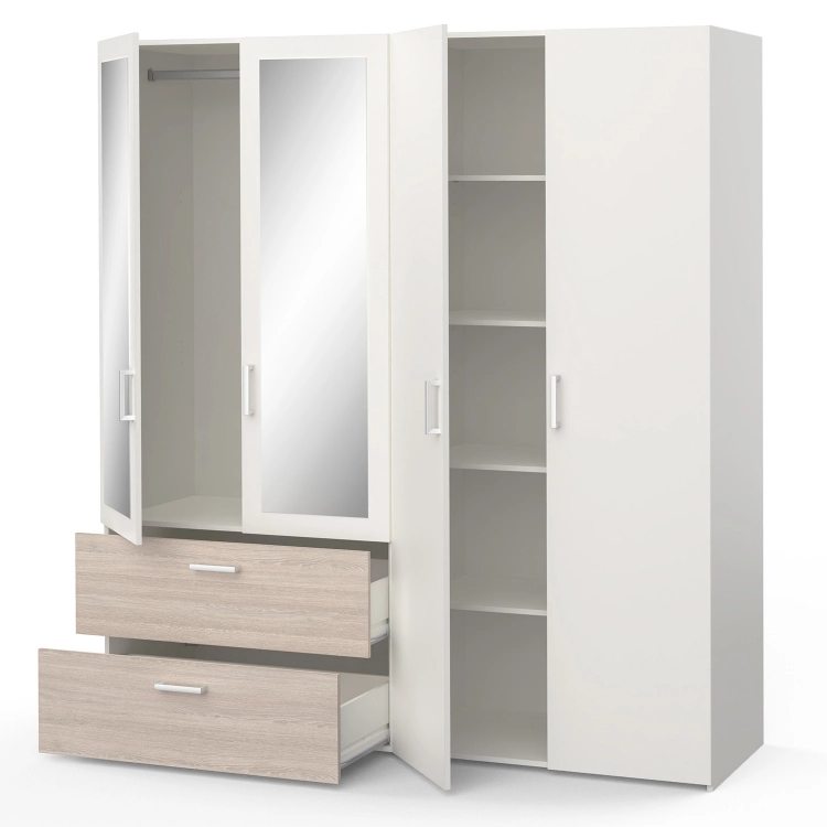 barevné provedení dub Shannon / perleťově bílá prostor dělený na poloviny v levé části šatní tyč, dvě velké zásuvky s kovovými pojezdy v pravé části čtyři variabilní police police a šatní tyč je možno umístit variabilně do obou částí oboje dveře v levé části opatřeny zrcadlem o rozměru (š/v) 32 × 126 cm
