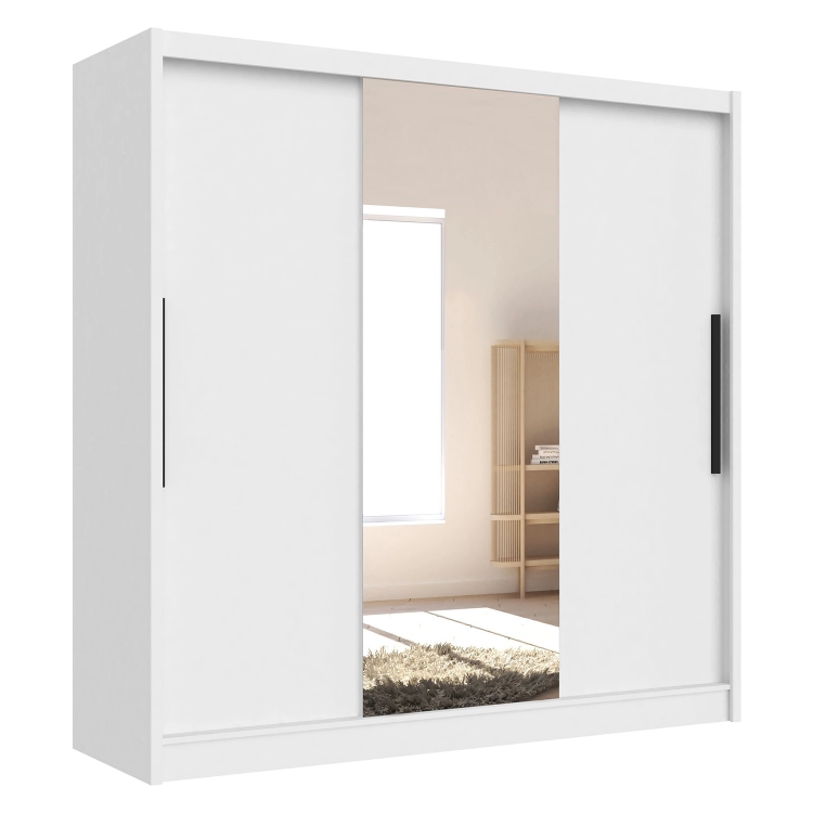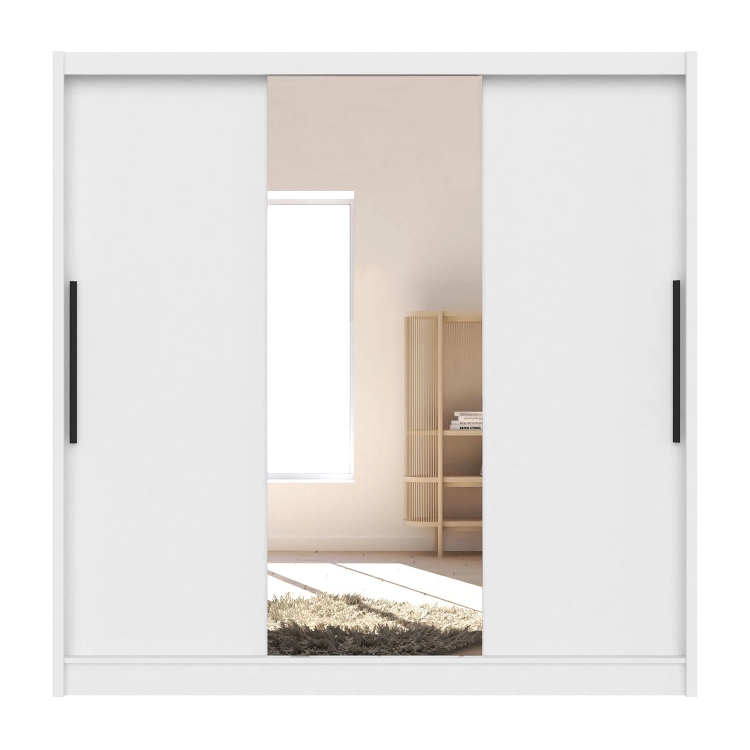 barevné provedení bílá 3 posuvné dveře, na středních dveřích zrcadlo o tloušťce 3 mm, plastové úchytky v levé části 4 police, šířka police 61 cm ve střední a pravé části 2 šatní tyče, každá v délce 68 cm, široká police na klobouky, šířka police 138 cm