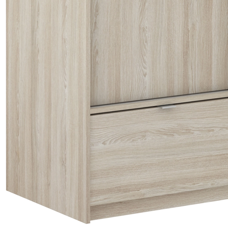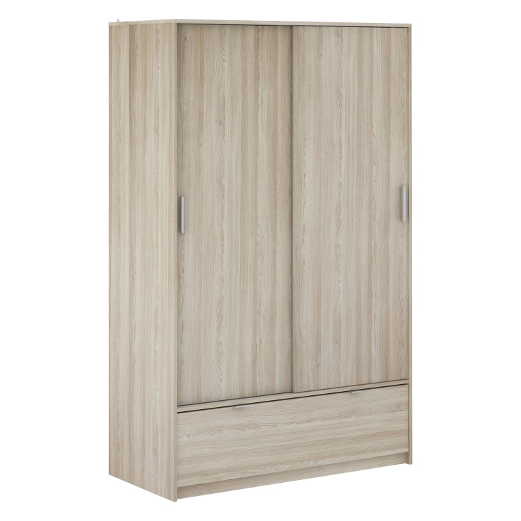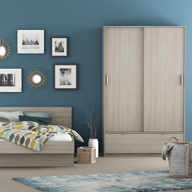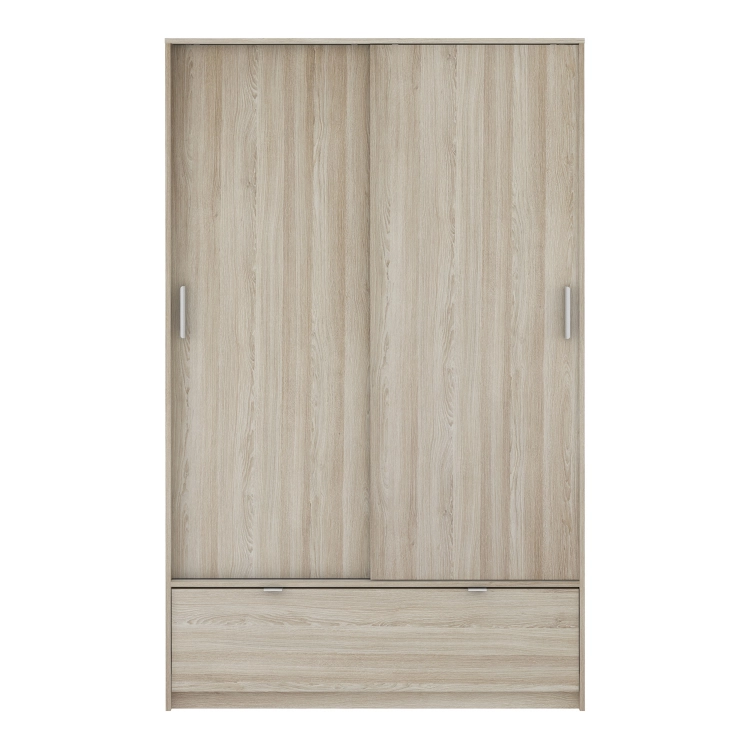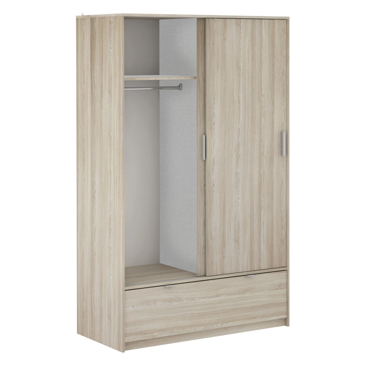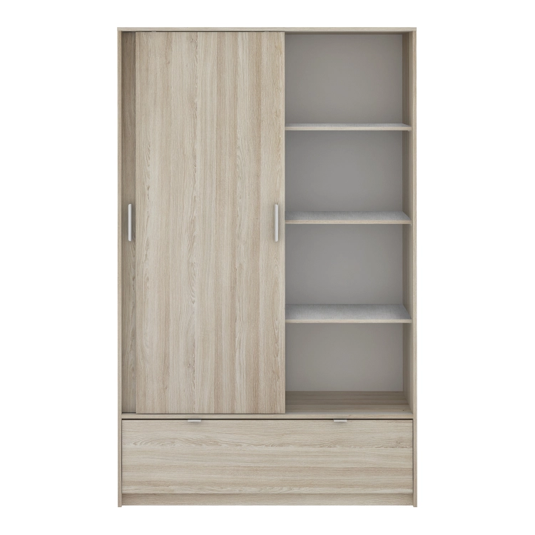 barevné provedení dub Shannon dvoje posuvné dveře, velká zásuvka s kovovými pojezdy horní prostor dělený na poloviny, šatní tyč a 4 police možno variabilně rozmístit do obou částí