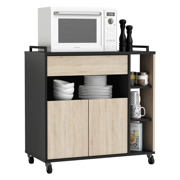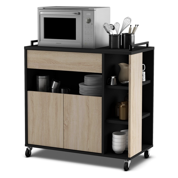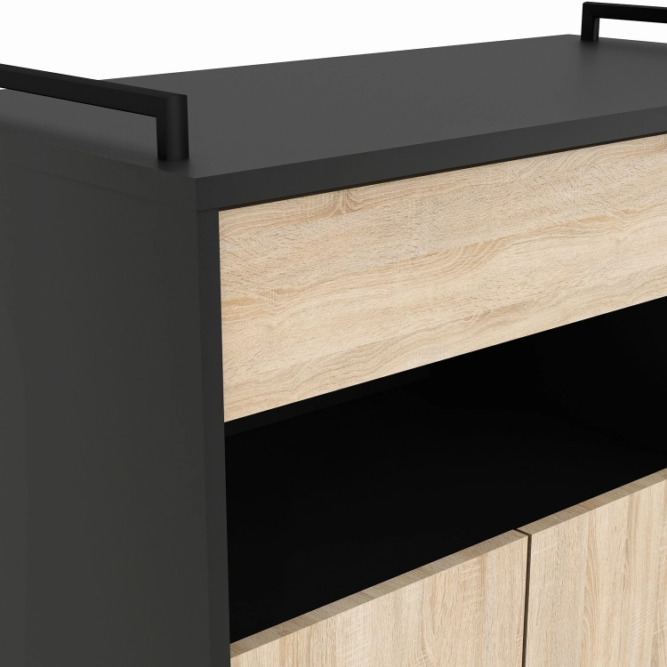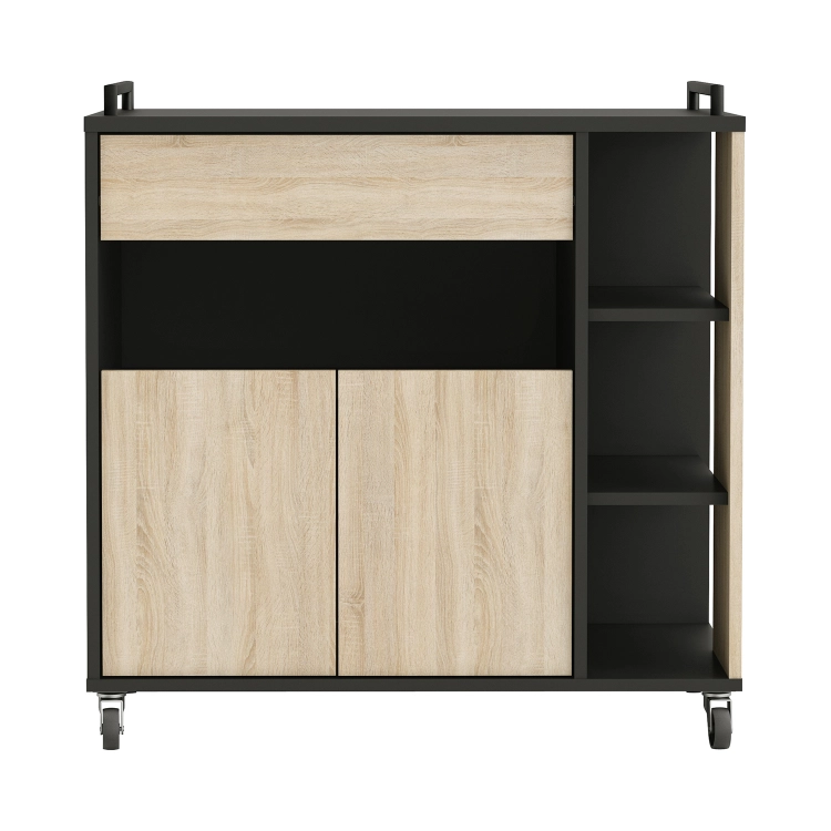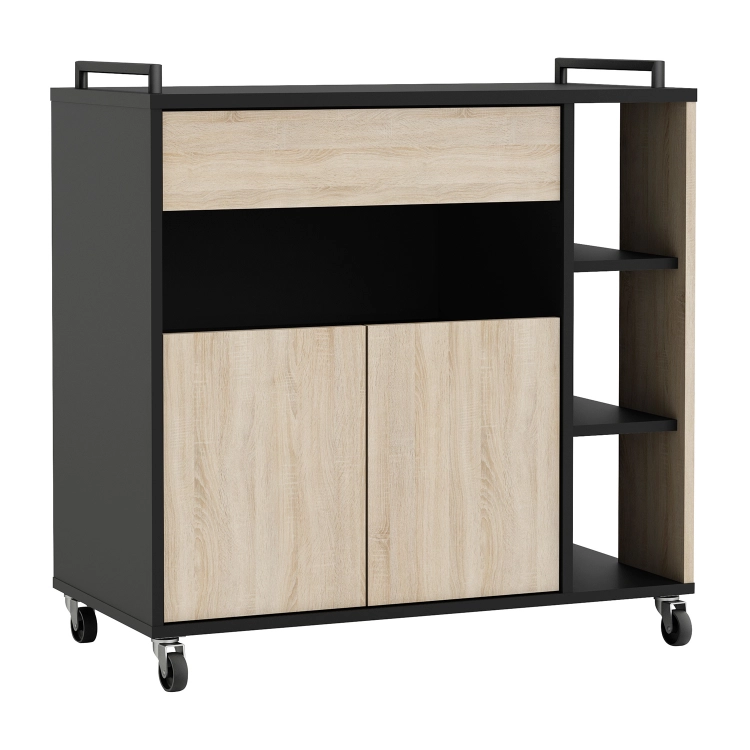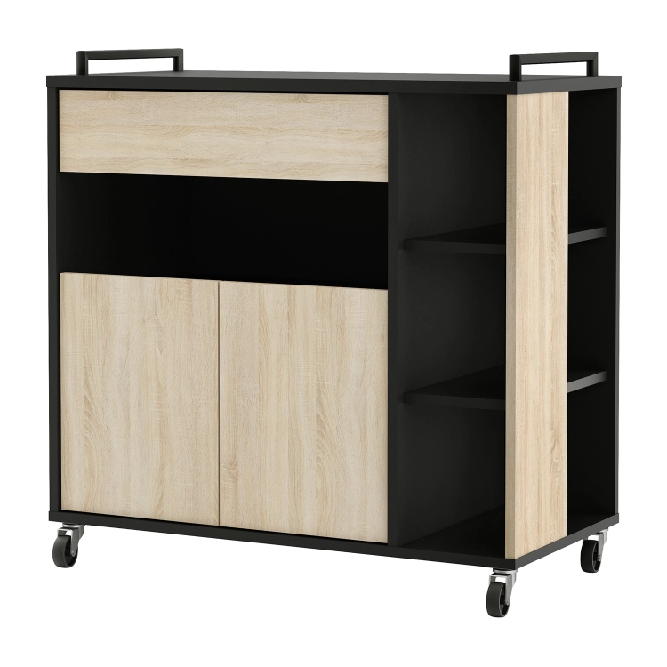 barevné provedení dub Sonoma / černá pojízdná na kolečkách jedna zásuvka s kovovými pojezdy 2 dvířka, uzavřené i otevřené police maximální nosnost horní desky 15 kg